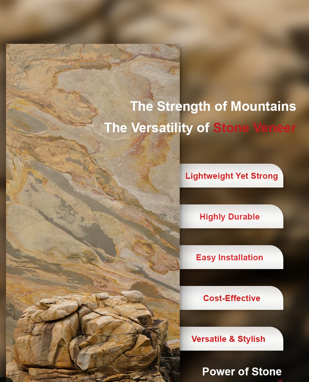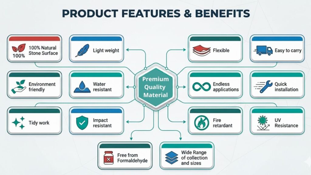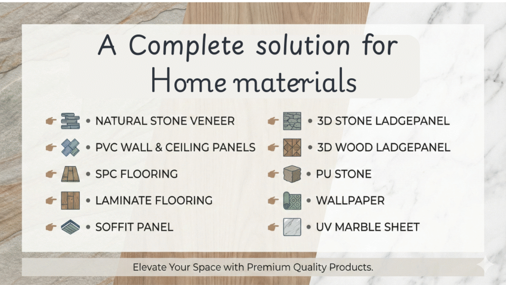your destination for advanced and aesthetic interior–exterior solutions. Our product portfolio includes Natural Stone Veneer, Walls & ceiling panels, SPC Flooring, Laminate Flooring, Soffit Panels, Stone & Wood 3D Wall Panels, PU Stone, Wallpapers, and UV Marble Sheets.